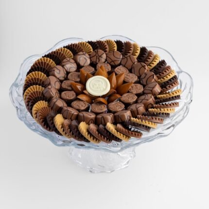 Our colourful crystal trays with Red Cocoa beans chocolates filled with pomme grenade & pistachio pralines.